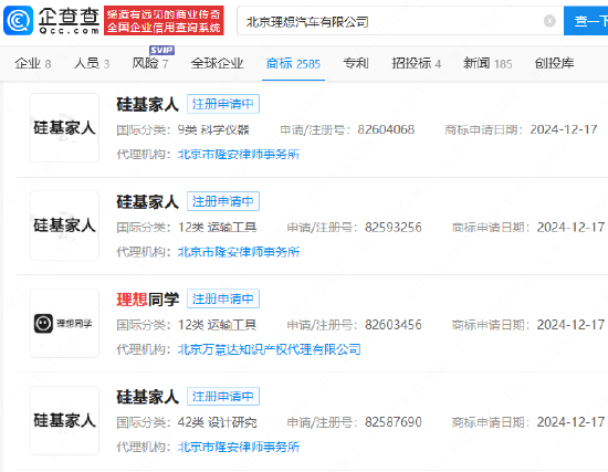新浪科技讯 1月21日下昼音信开云kaiyun,企查查APP露馅,近日,北京理念念汽车有限公司肯求注册三枚“硅基家东谈主”商标,海外分类为科学仪器、运载器用、盘算推算盘考,现时商标气象均为注册肯求中。