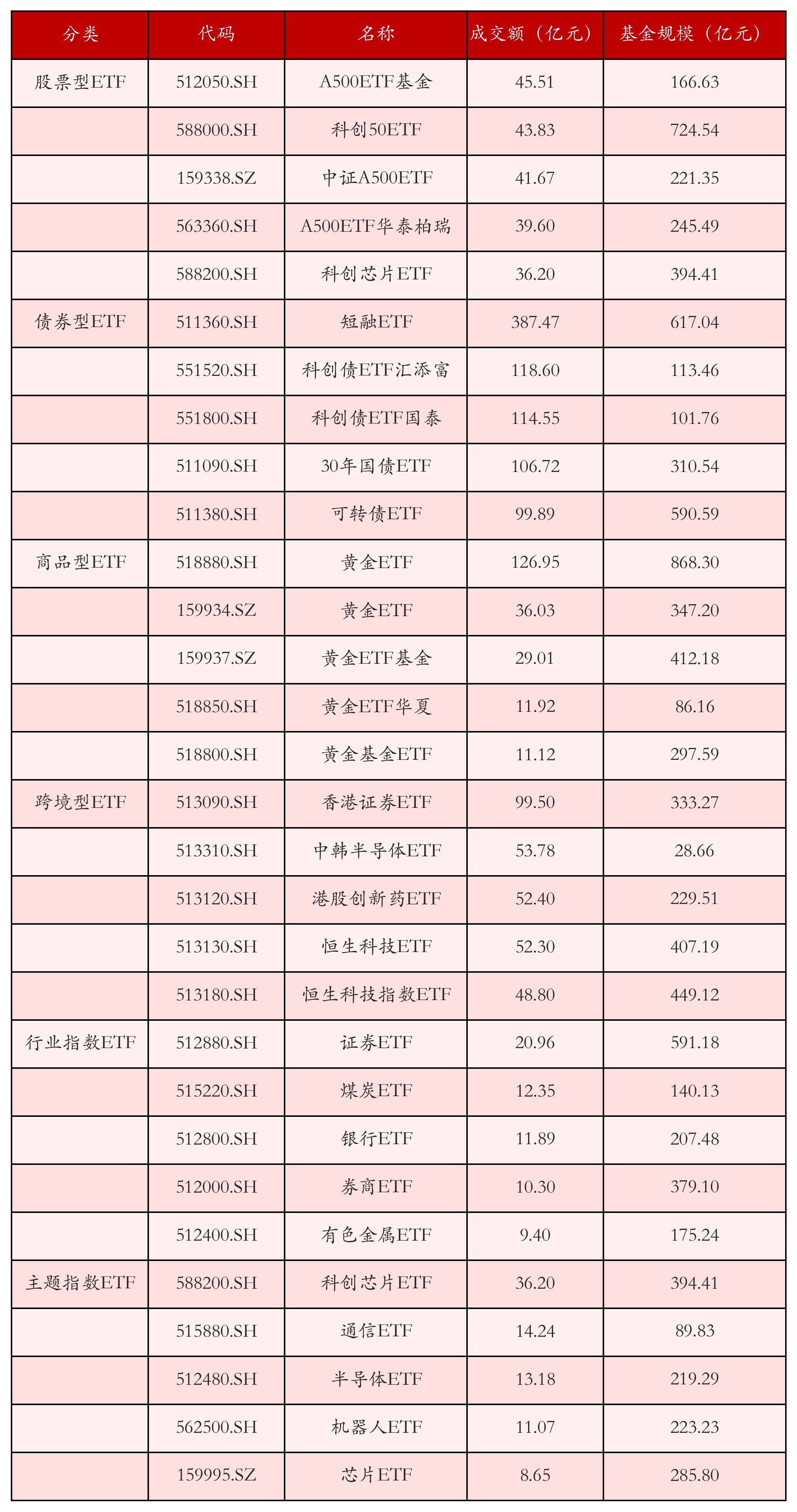 基于成交额对千般ETF本日的成交情况进行统计,成交额靠前的ETF产物如下表所示。股票型ETF中成交额排行前3位的ETF产物分别为A500ETF基金(512050.SH)、科创50ETF(588000.SH)和中证A500ETF(159338.SZ),本日成交额分别为45.51亿元、43.83亿元和41.67亿元。