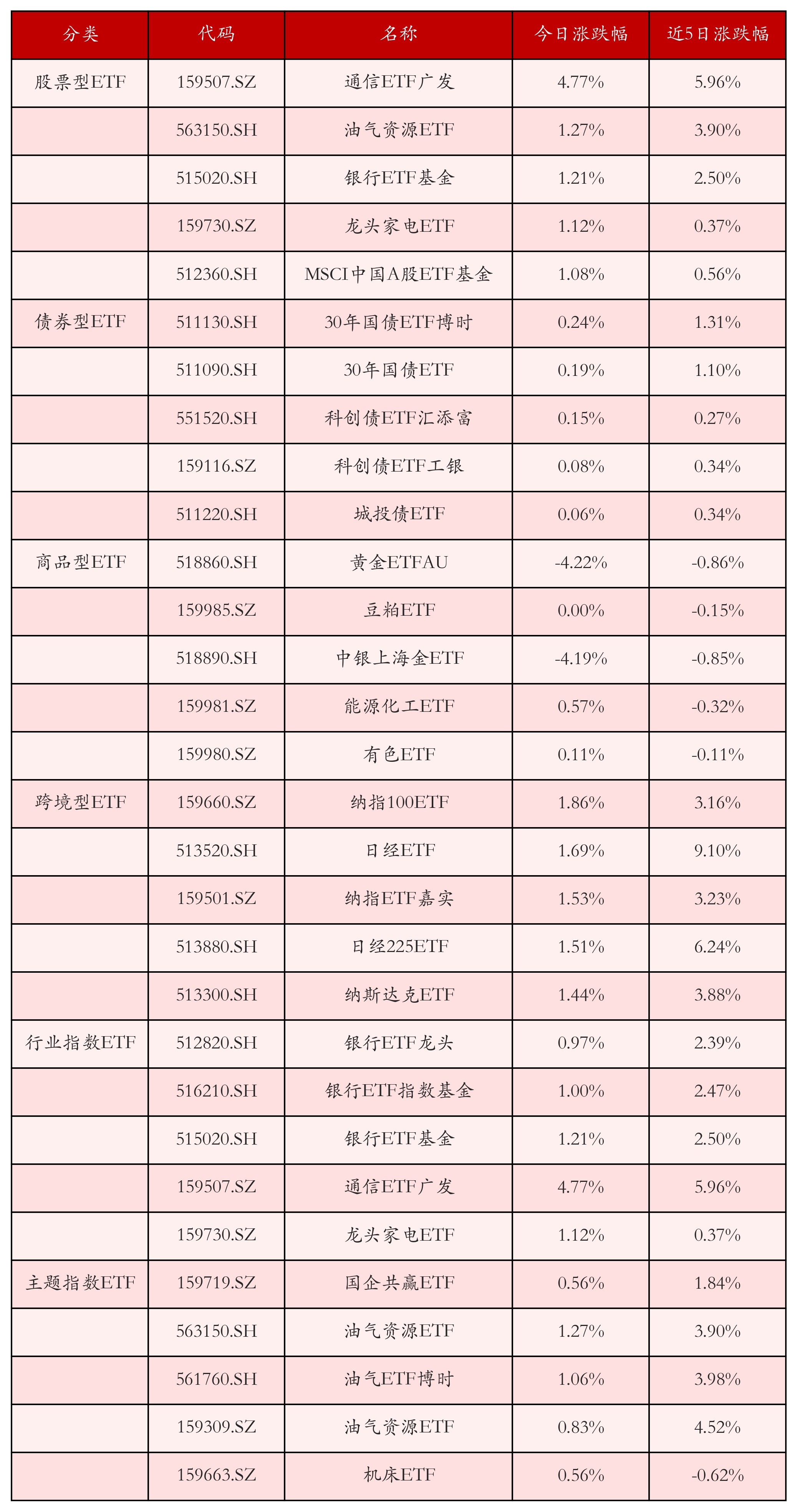 从不同投资种类、行业、主题的ETF产物中找出本日走势行情排行前5的ETF基金,本日涨幅靠前的ETF产物如下表所示。股票型ETF中涨跌幅排行前3位的ETF产物分别为通讯ETF广发(159507.SZ)、油气资源ETF(563150.SH)和银行ETF基金(515020.SH),本日收益率分别为4.77%、1.27%和1.21%。