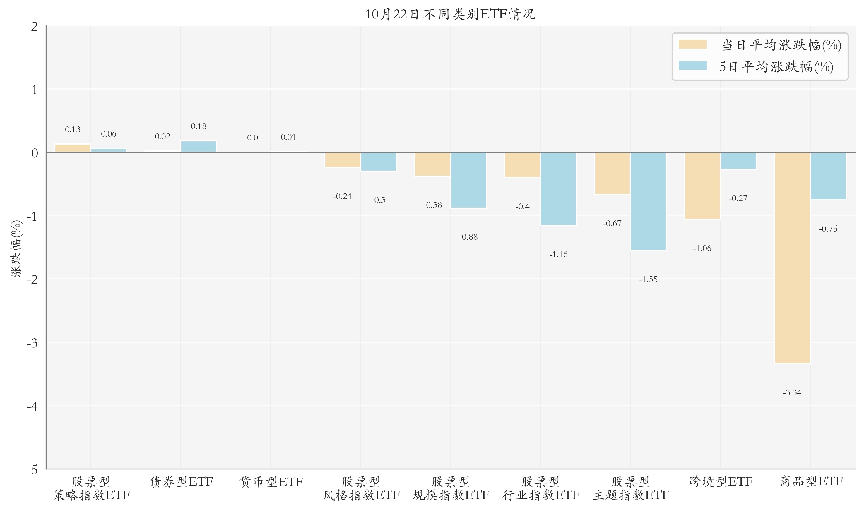 凭据ETF基金的投资领域,将ETF基金分辩为股票型范畴指数ETF、股票型行业指数ETF、股票型战术指数ETF、股票型格调指数ETF、股票型主题指数ETF、债券型ETF、商品型ETF、货币型ETF、跨境ETF,本日股票型战术指数ETF推崇最优,该类ETF的平均涨跌幅为0.13%;商品型ETF的推崇最差,该类ETF的平均涨跌幅为-3.34%。