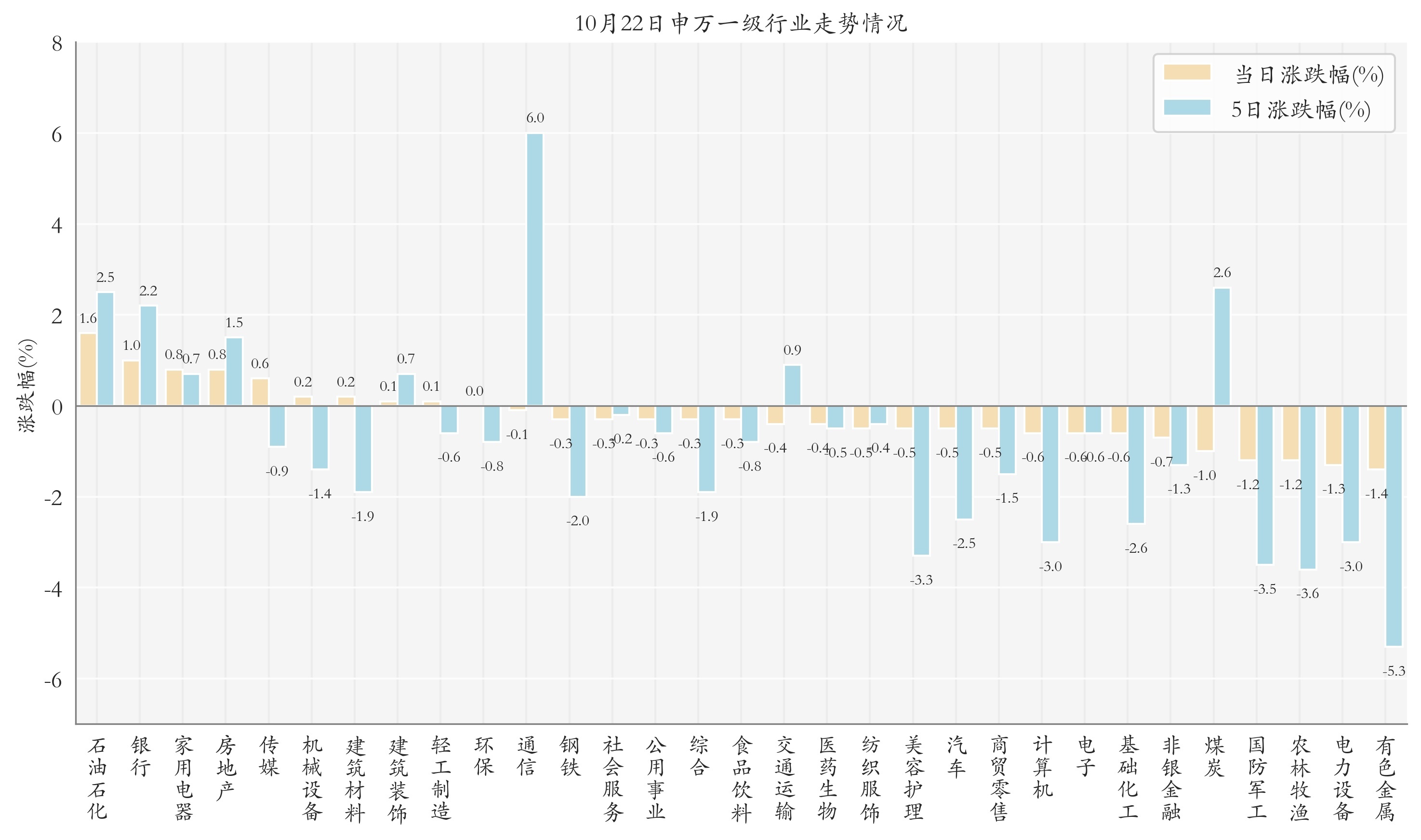 统计本日一起申万一级行业涨跌幅情况,石油石化、银行与家用电器本日走势排行靠前,日涨跌幅分别为1.58%、0.97%与0.82%,有色金属、电力成立与农林牧渔的走势排行靠后,日涨跌幅分别是-1.36%、-1.29%与-1.19%;近5个交游日通讯、煤炭与石油石化的走势排行靠前,近5日涨跌幅分别为6.01%、2.59%与2.5%,有色金属、农林牧渔与国防军工的走势排行靠后,近5日涨跌幅分别为-5.32%、-3.58%与-3.46%。