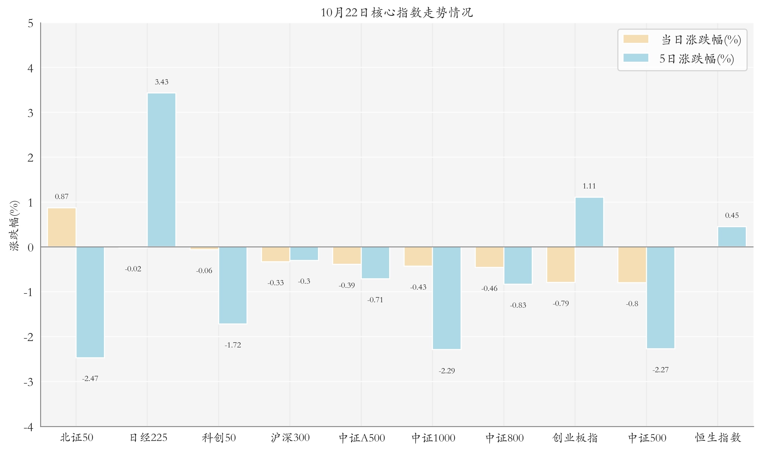 统计A股与国外主要中枢指数走势,本日(10月22日,下同)三大指数集体下降,其中上证指数下降0.07%,收于3913.76点,日内最高3918.59点;深证成指下降0.62%,收于12996.61点,日内最高13078.64点;创业板指下降0.79%,收于3059.32点,日内最高3089.76点。本日北证50、日经225与科创50走势排行靠前,日涨跌幅分别为0.87%、-0.02%与-0.06%;近5个交游日日经225、创业板指与恒生指数的走势排行靠前,近5日涨跌幅分别为3.43%、1.11%与0.45%。