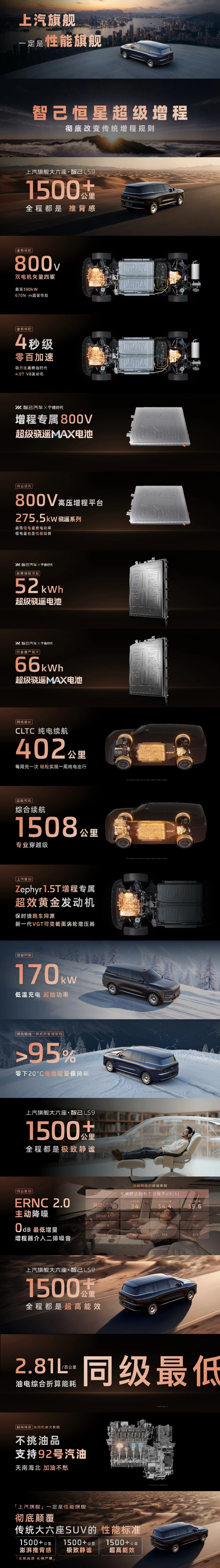 智己 LS9 搭载“恒星”超等增程本事,配备 1.5T 增程器及前后双电机。其中,52 Ultra 和 66 Ultra 车型的系统空洞最大功率远隔为 380 千瓦和 390 千瓦,峰值扭矩均为 670 牛 米,0-100 公里 / 小时加快时间均为 4.9 秒。此外,智己 LS9 后续还将推出三电机四驱版块。